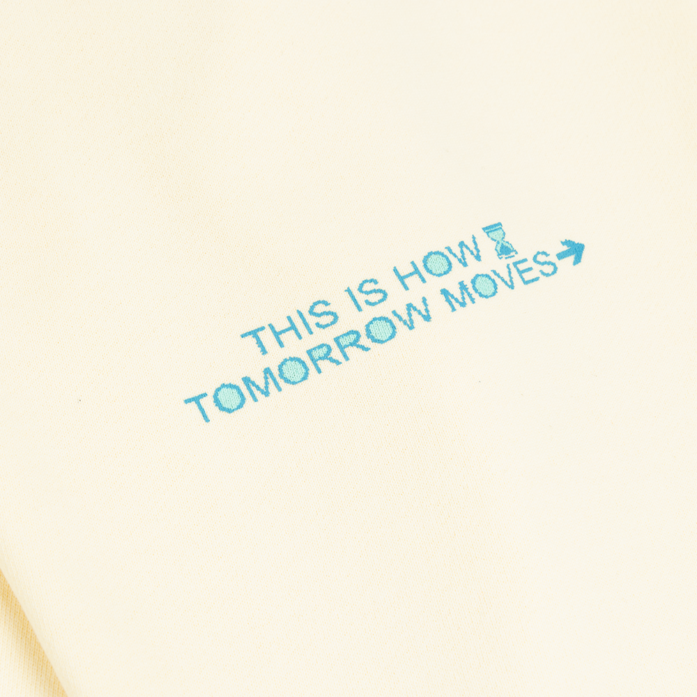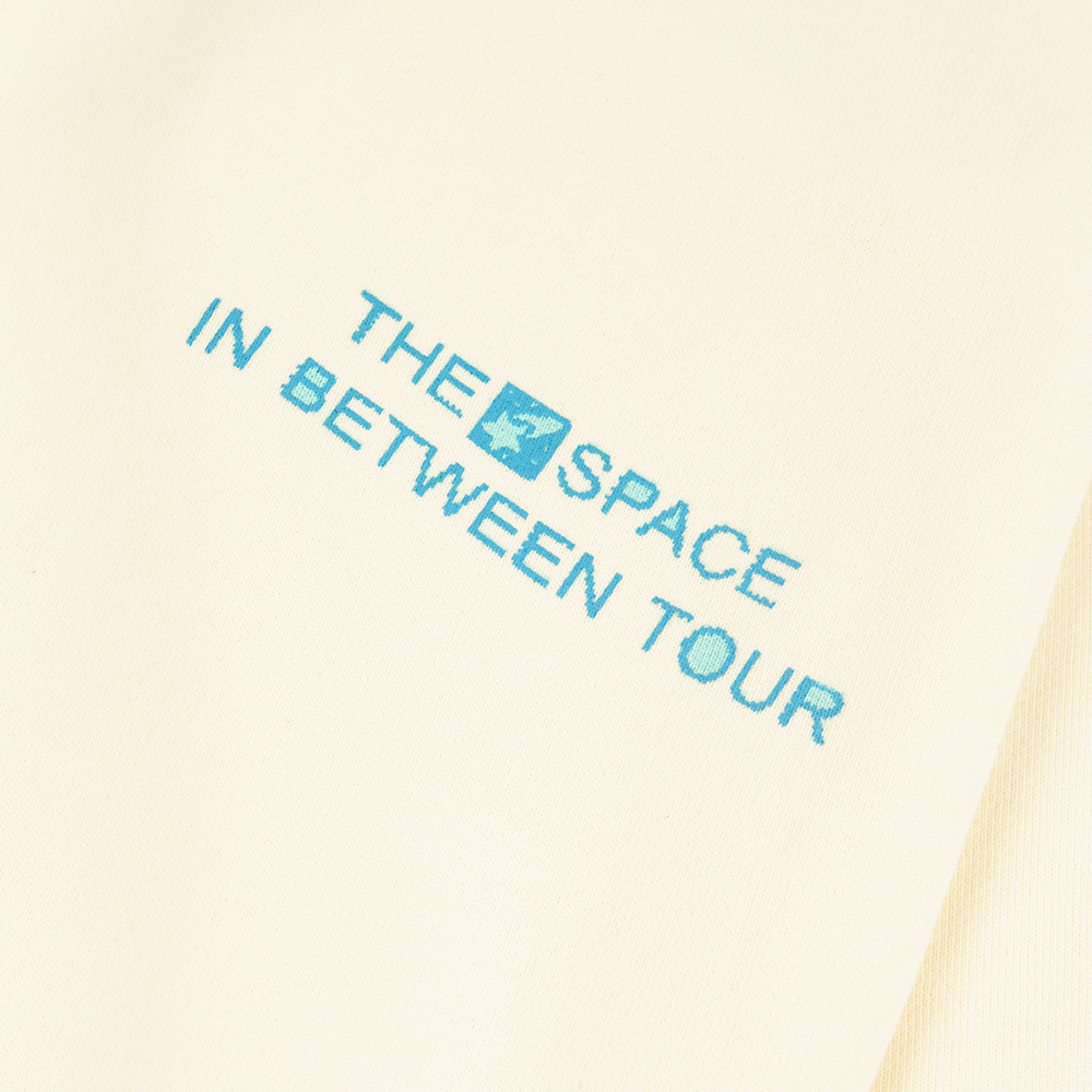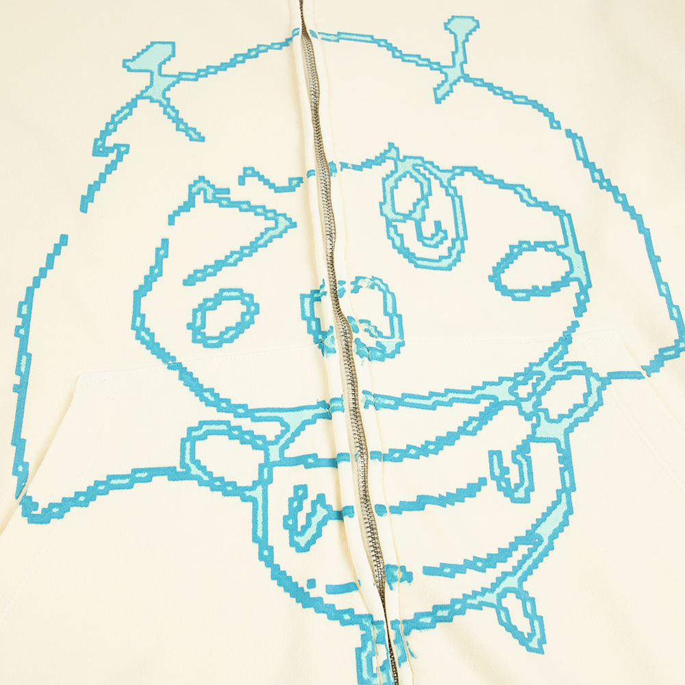 Garment dyed zip hoodie in vanilla ice with screenprinted graphics on front and back.